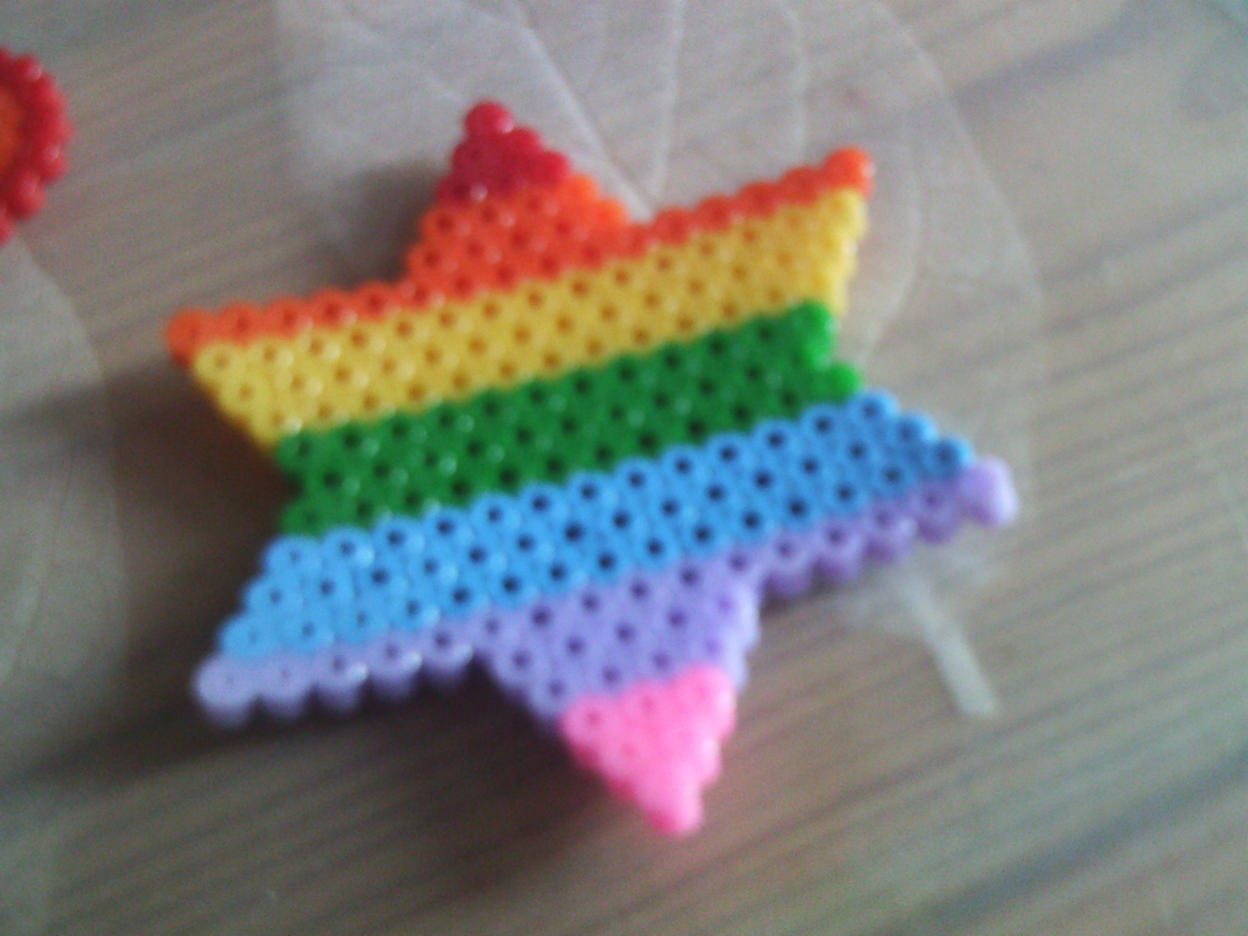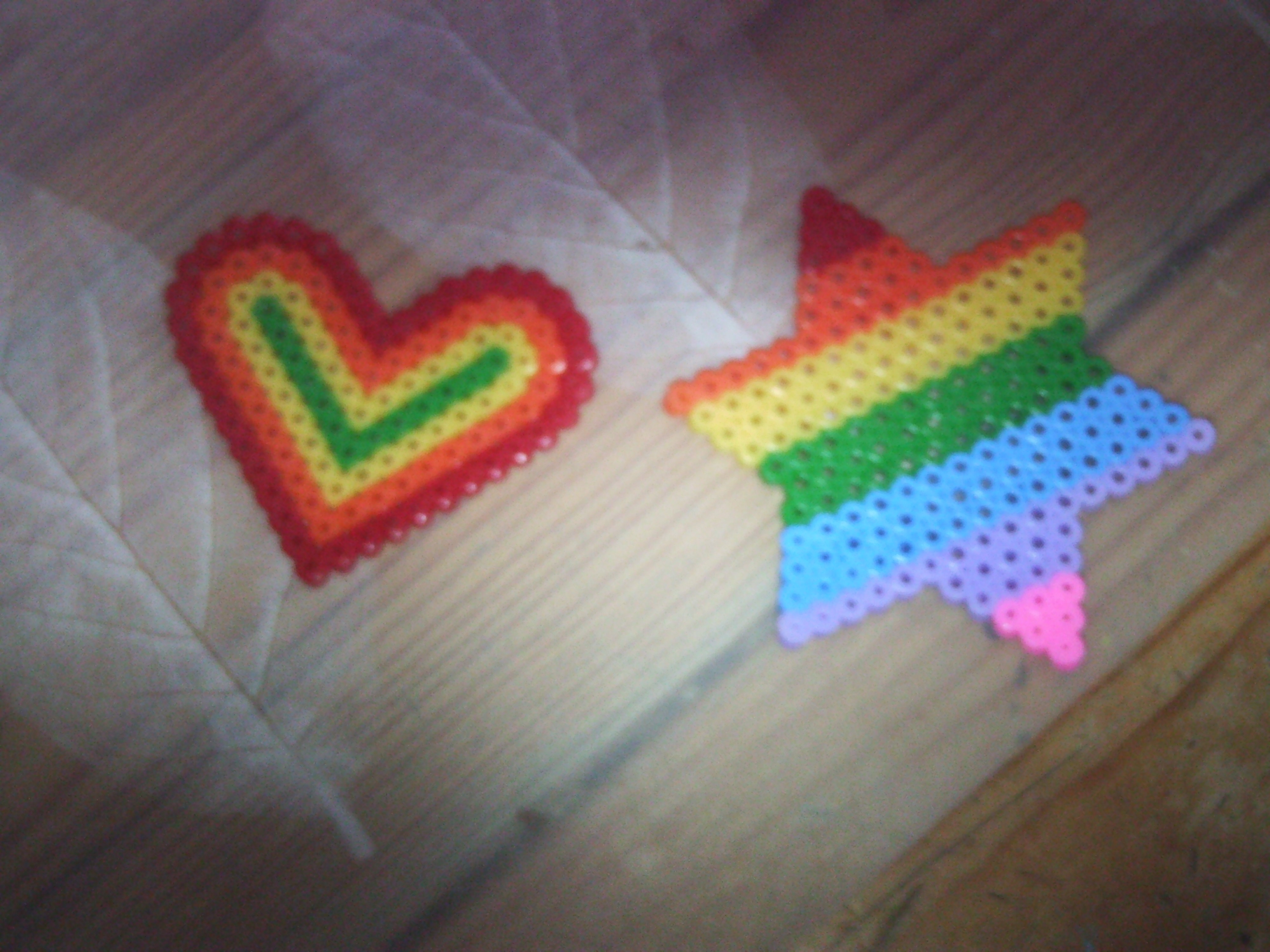 eerst hadden we niks te doen en hadden we gewoon even de strijkkralen gepakt omdat we ons te pletter verveelden. we dachten van: nou ja... we hebben niks anders te doen dus het moet maar. dus ik maakte een ster en kiki een hartje.